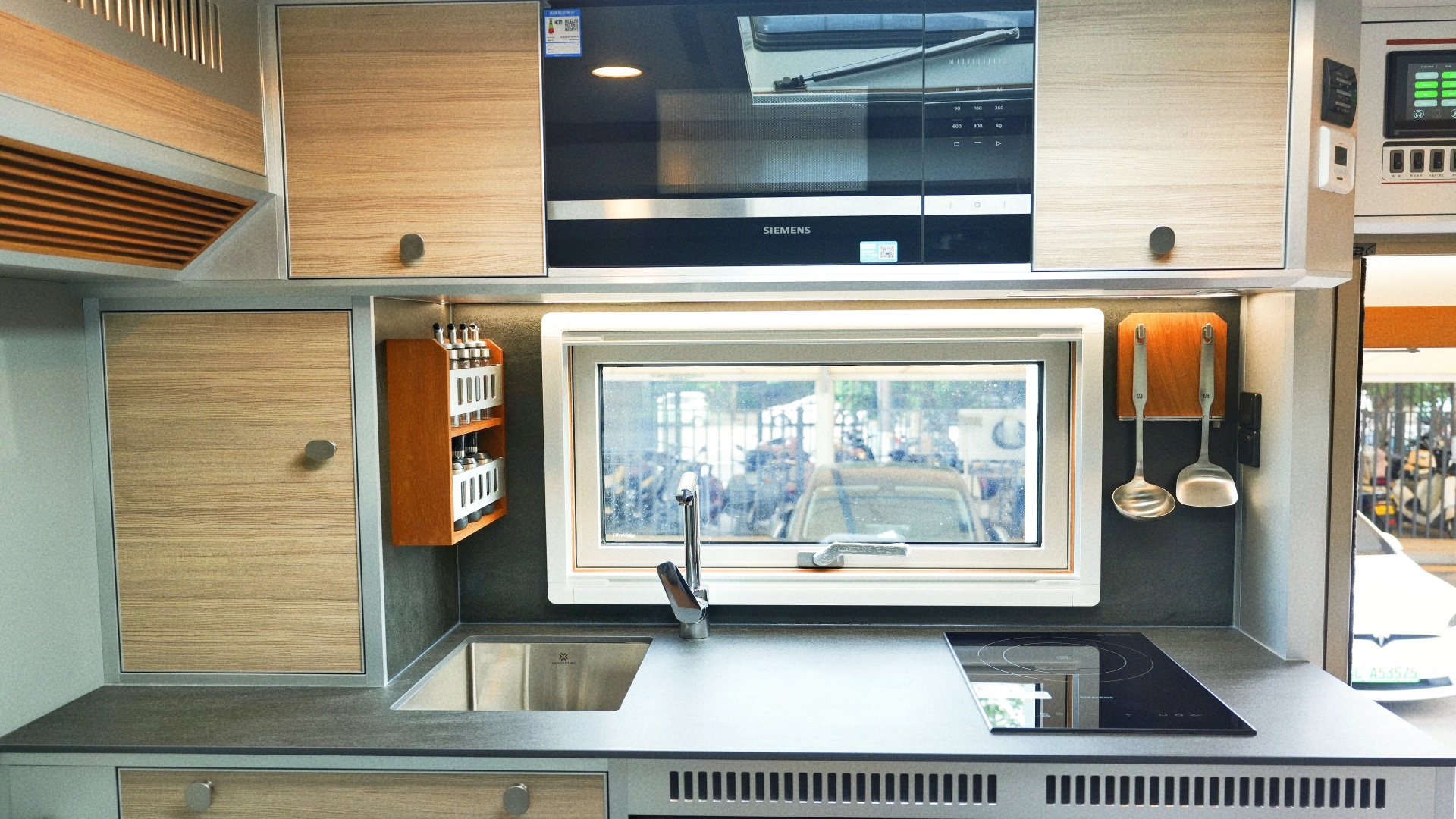 宜家风格设计,岩板台面及原木色柜体,凸显轻奢品质。内嵌式西门子单眼电磁炉、隐藏式排脱油烟机,简约精致。