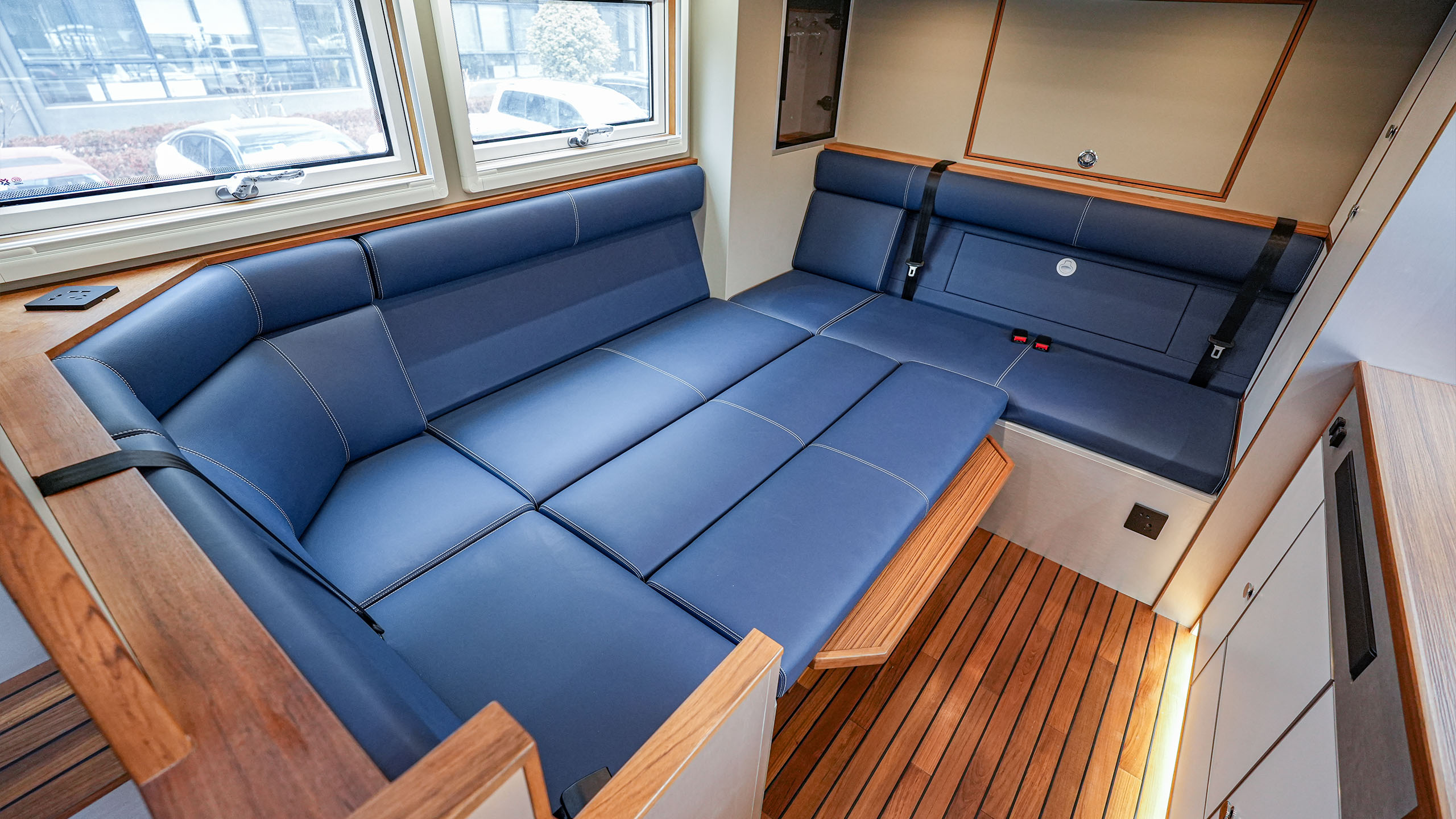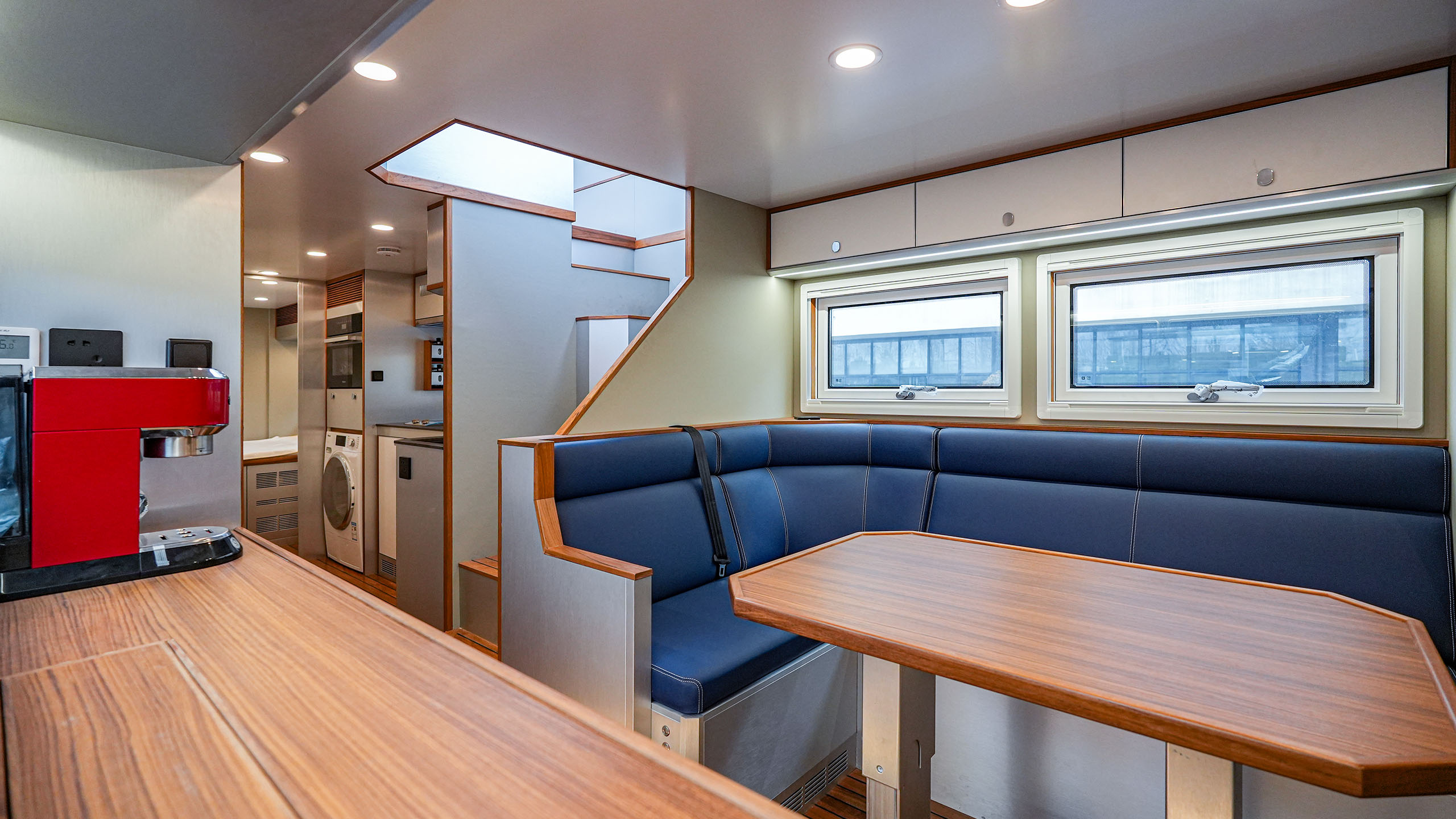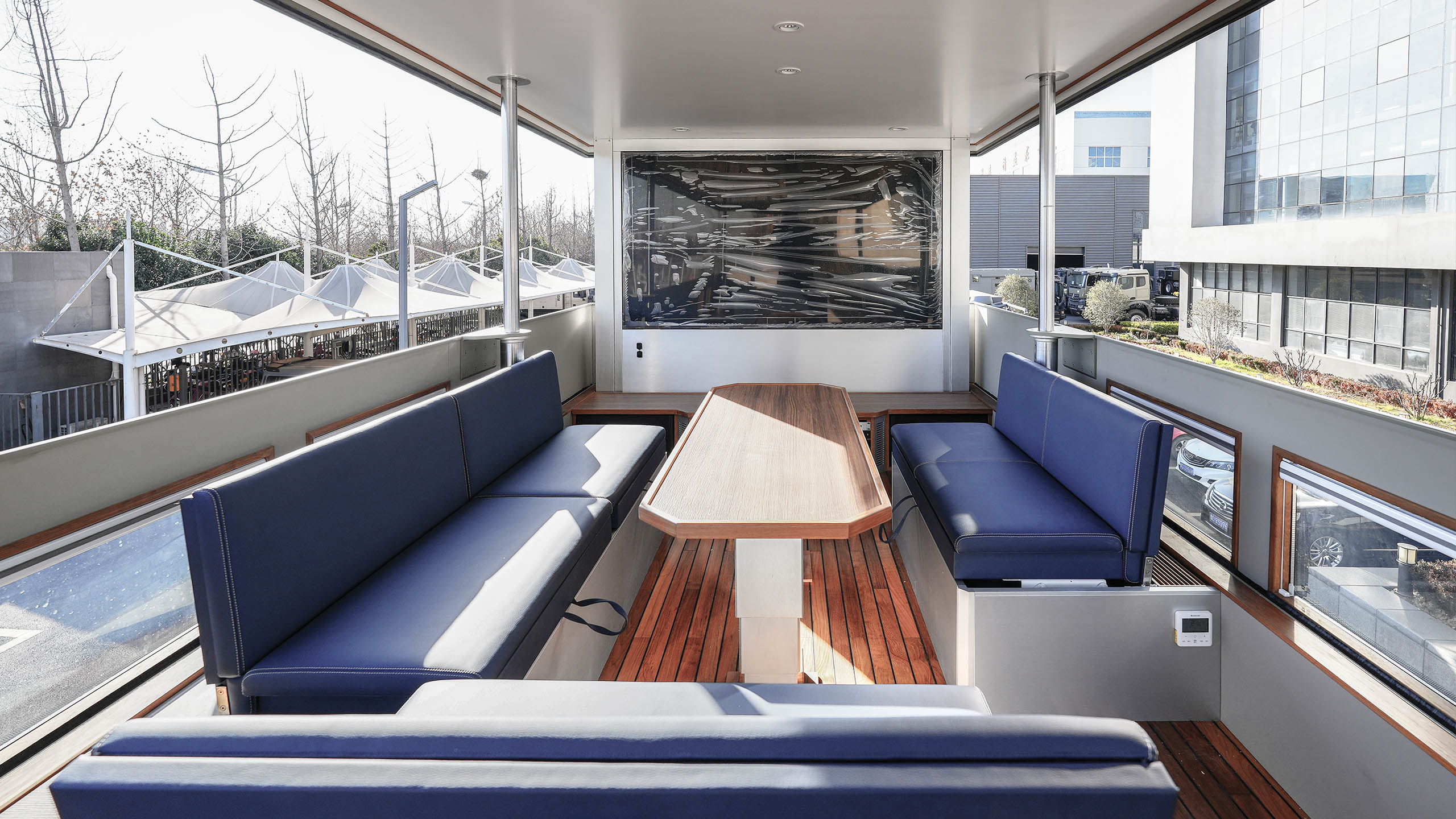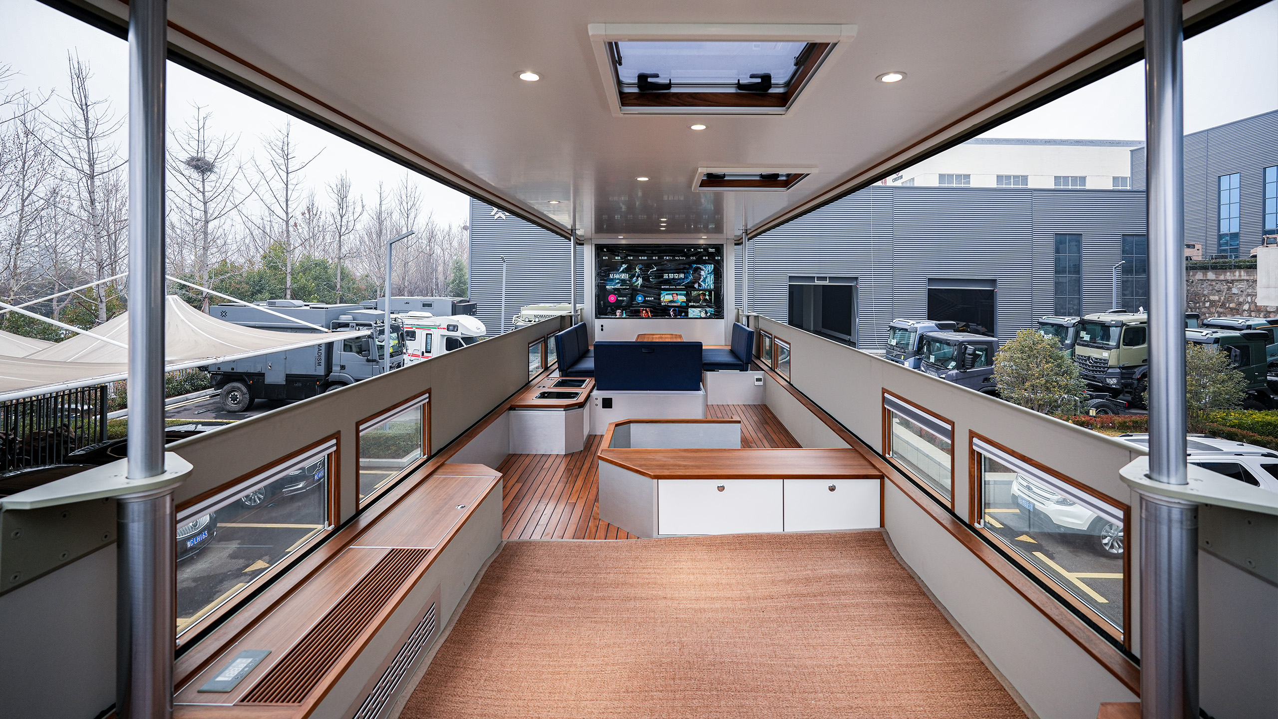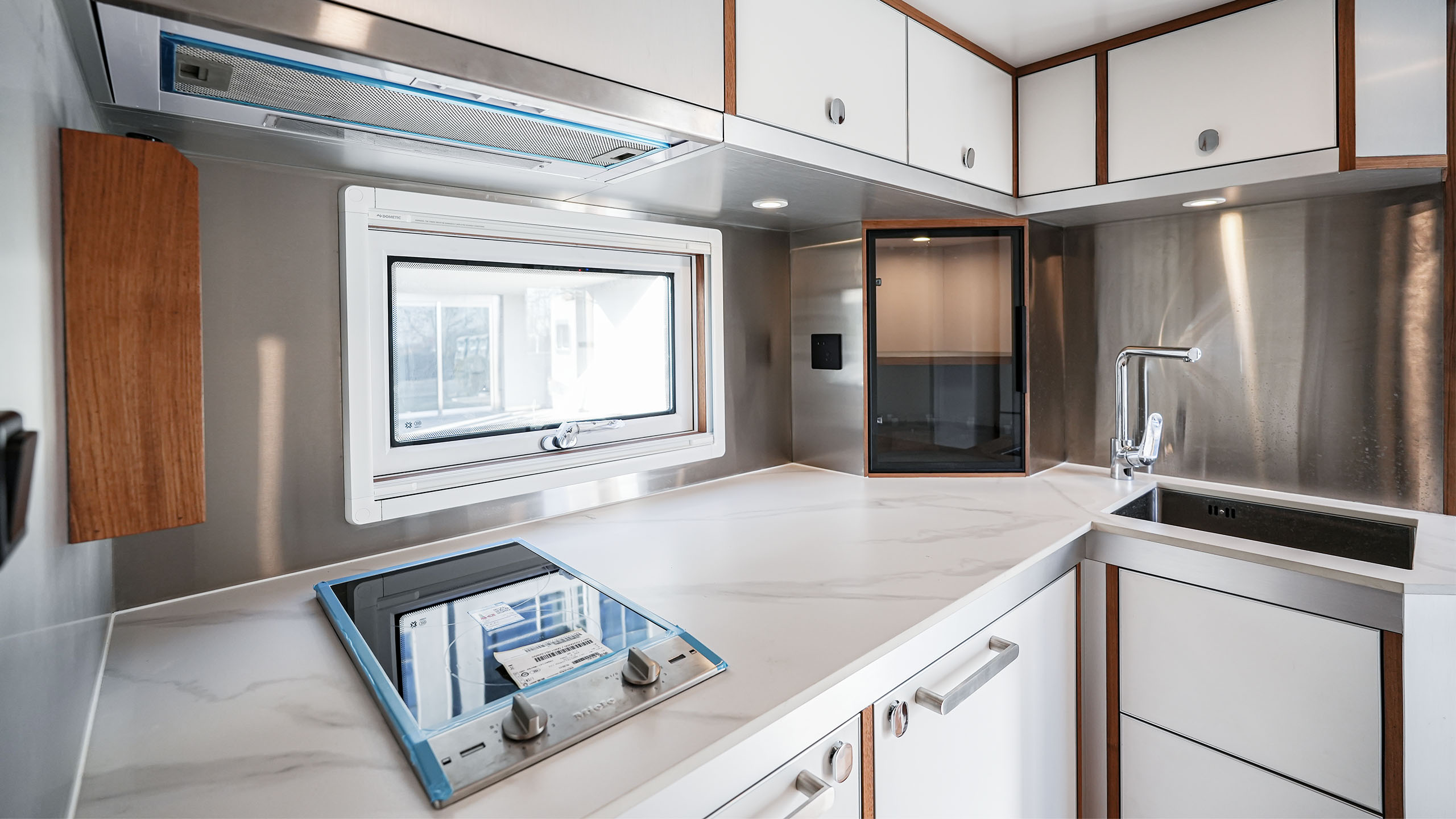 首款L型橱柜车型,精美浅色台面及柜体,凸显轻奢品质。内嵌式美诺双眼电磁炉、隐藏式排脱油烟机,简约精致。设计多处储物柜、抽屉等均带有锁扣,避免车辆行驶中意外开启,贴心周到。