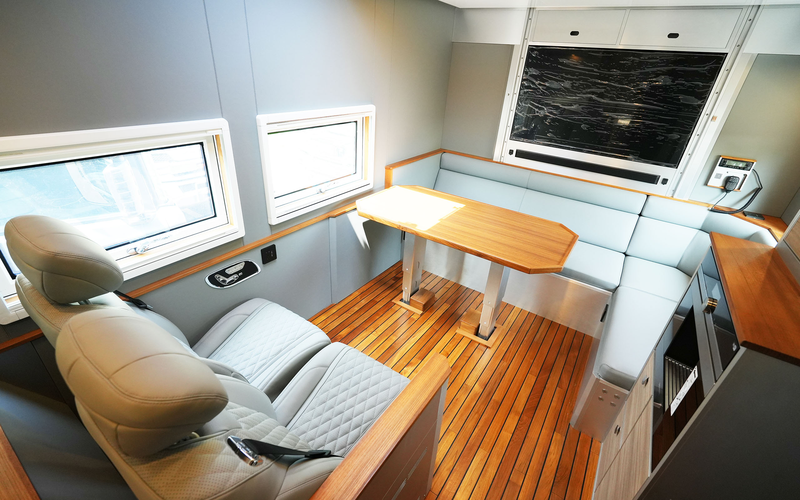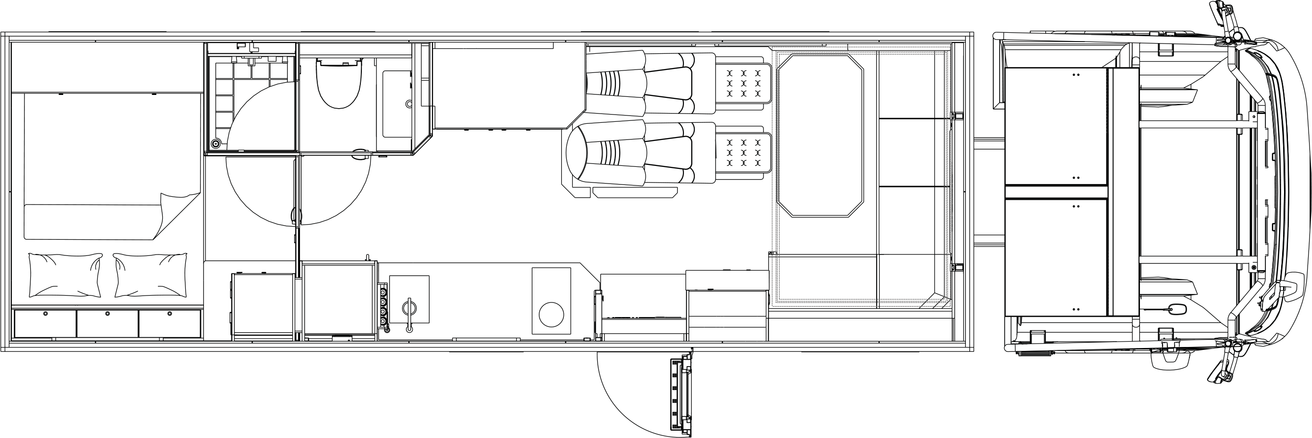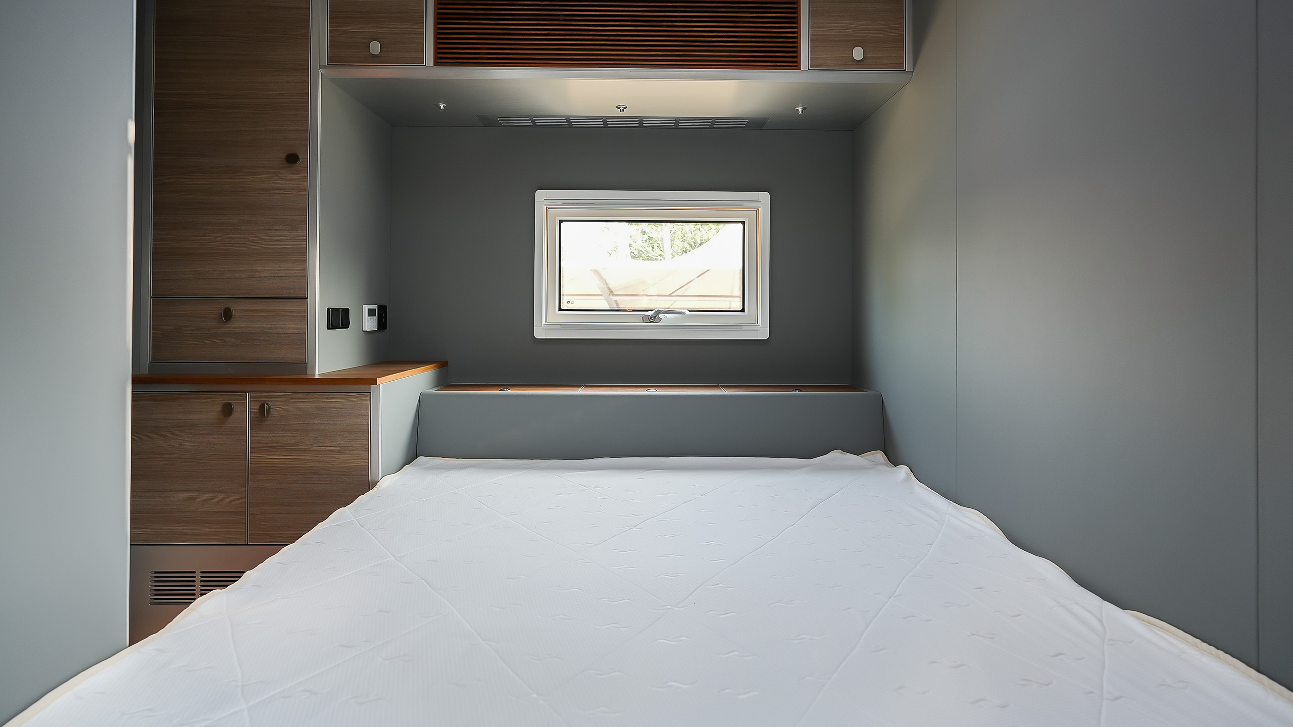 车厢尾部的独立主卧设计独具匠心,配备了2000×1500mm的双人大床,搭配高品质的乳胶床垫,确保了深沉而舒适的睡眠体验。