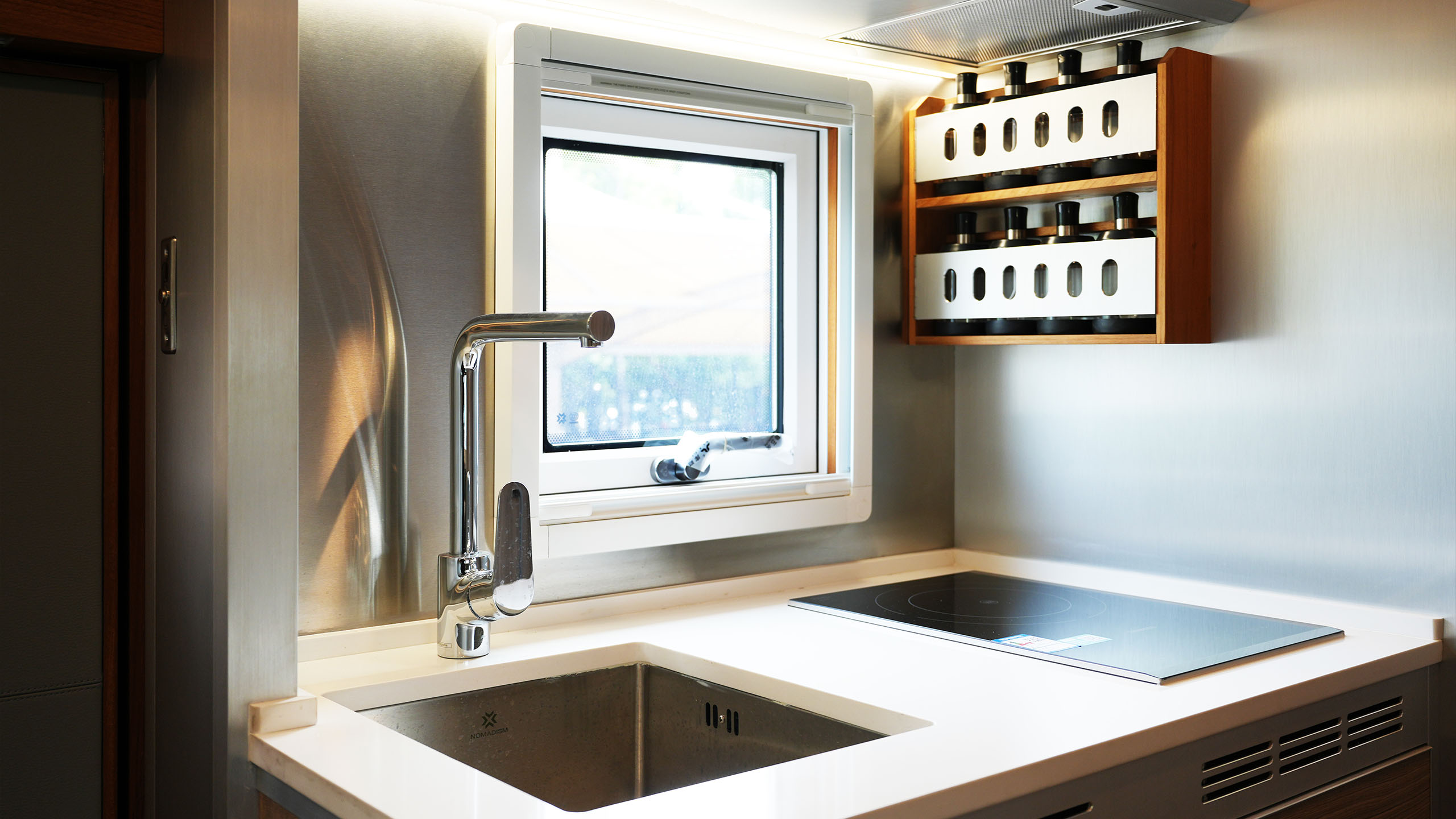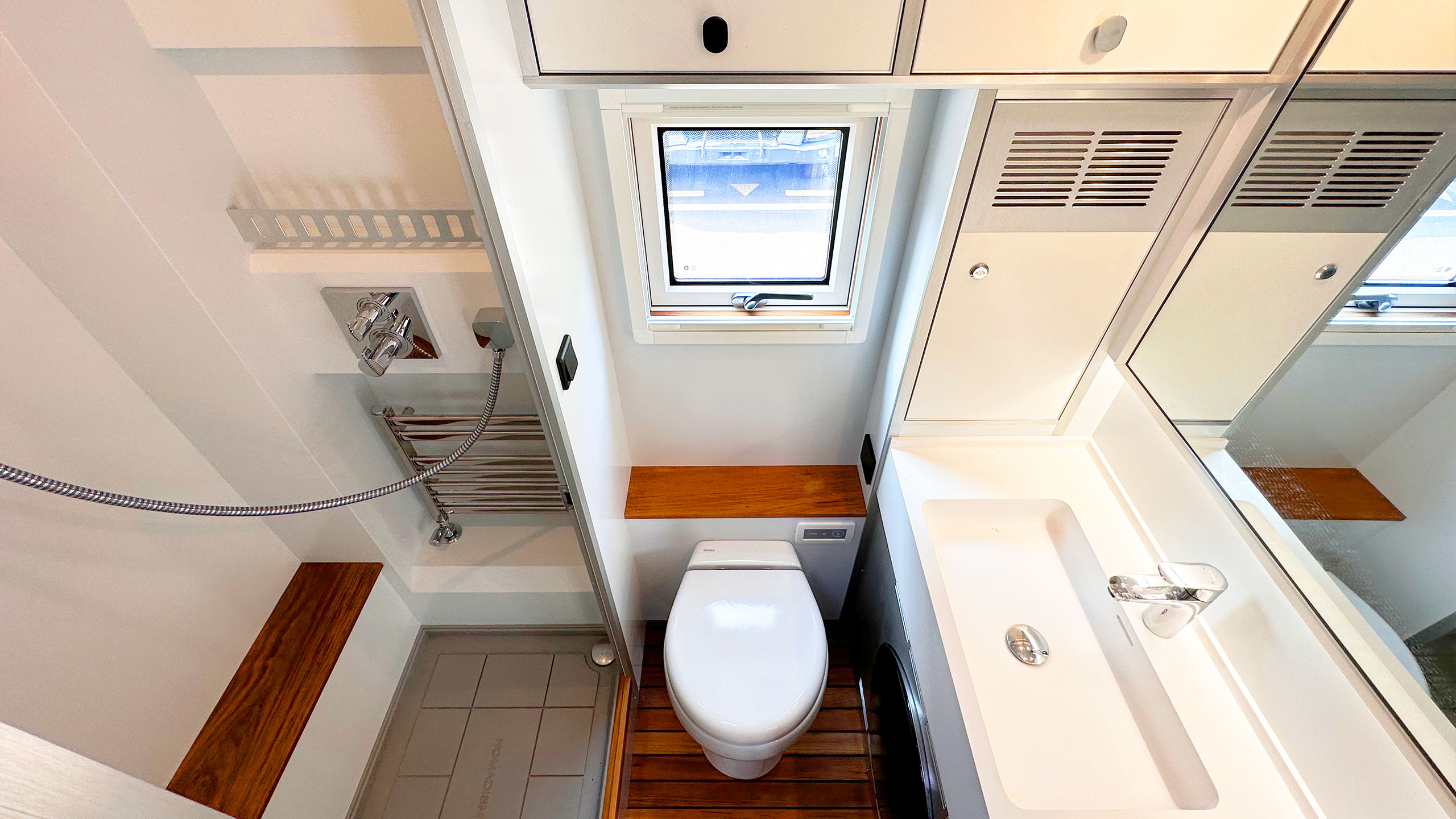 洗手台、电动粉碎马桶以及淋浴区经过巧妙排列,使得每个区域都能高效利用,各得其所。