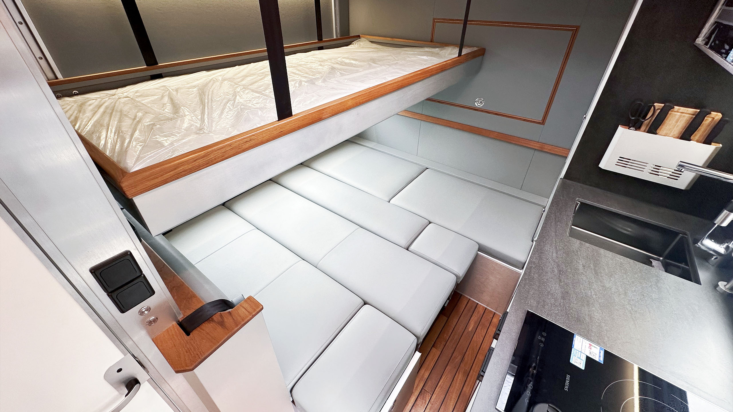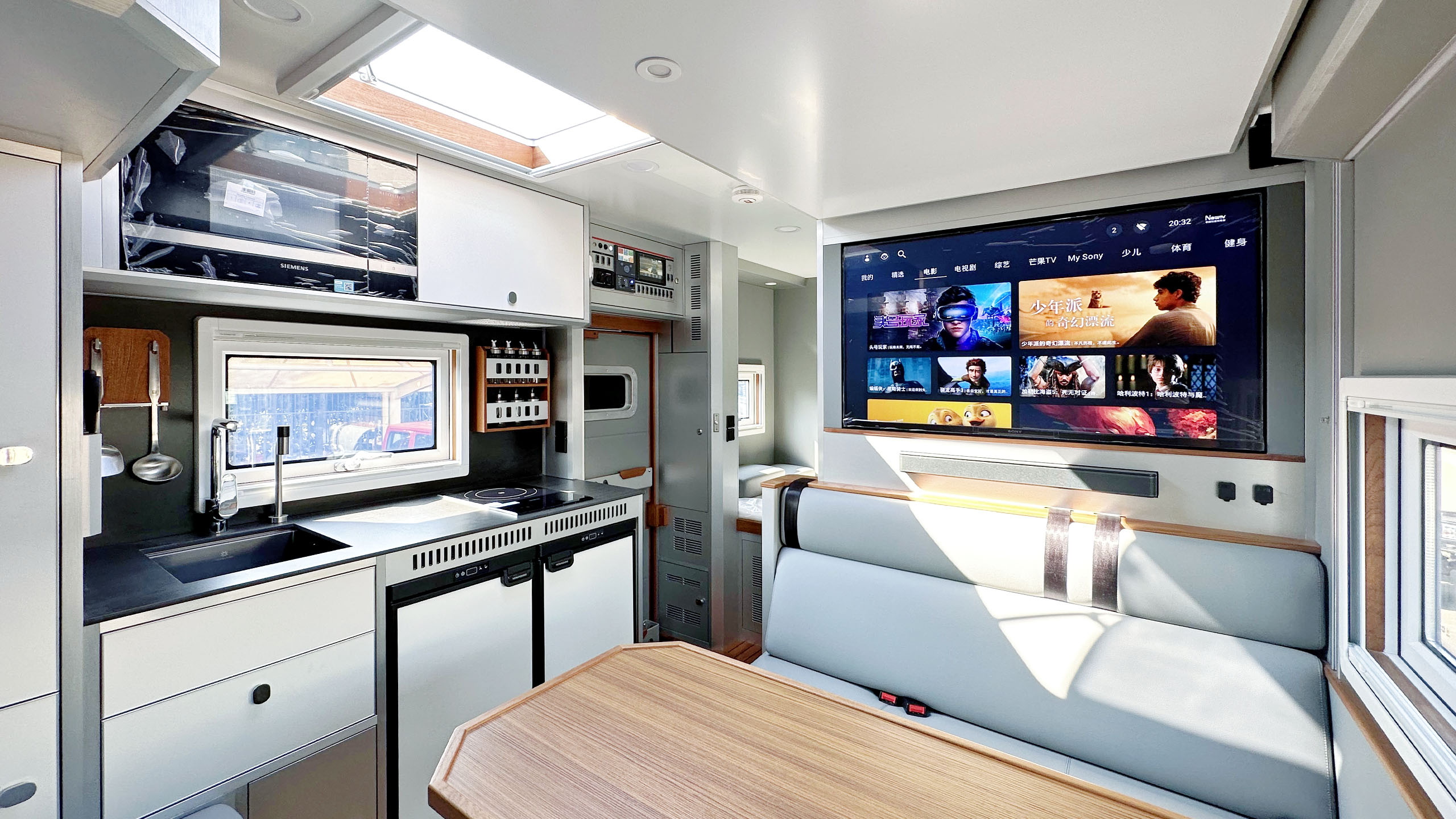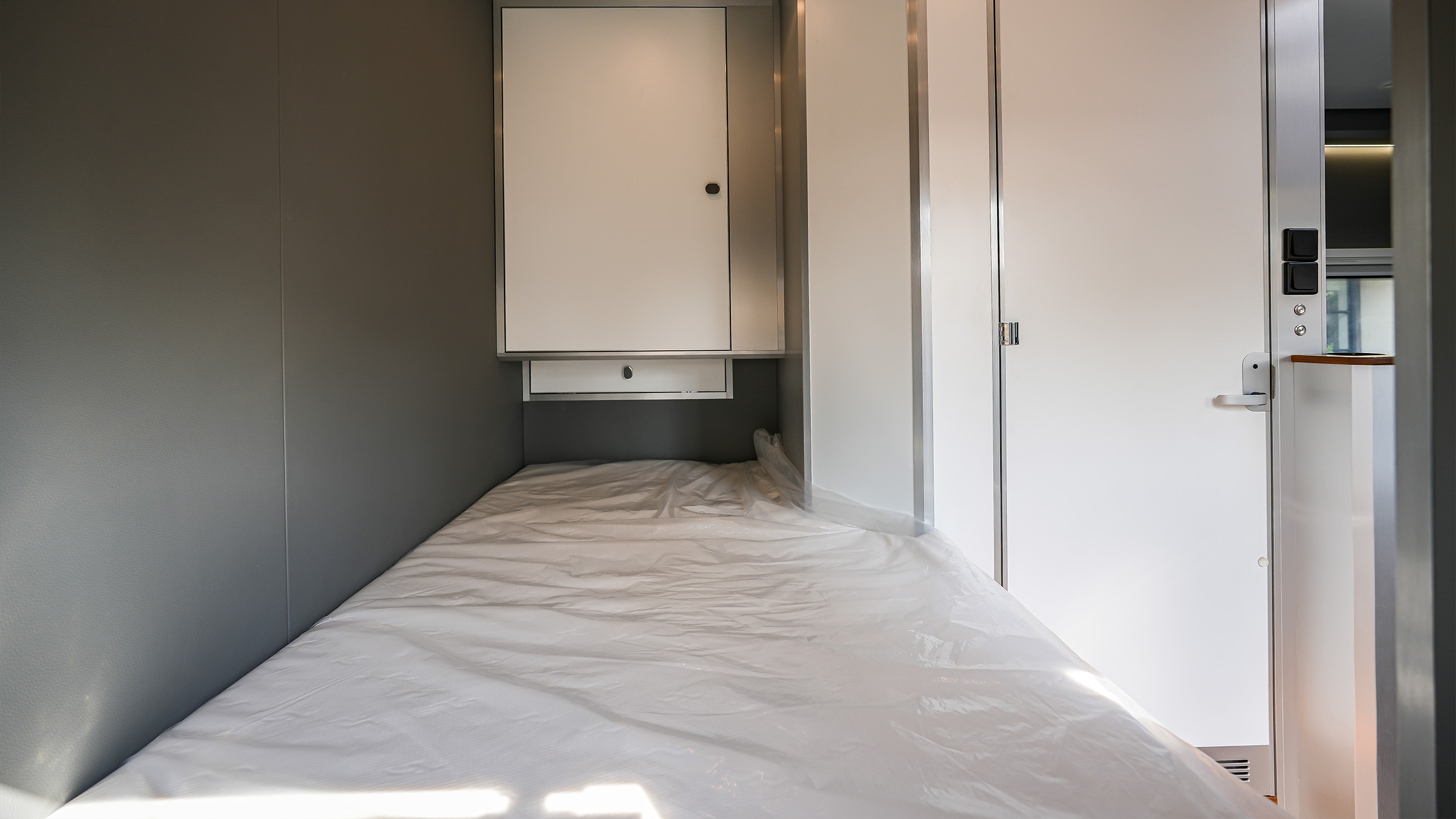 车厢尾部的独立主卧设计独具匠心,配备了1,990×1,045mm的单人床,搭配高品质的乳胶床垫,确保了深沉而舒适的睡眠体验。