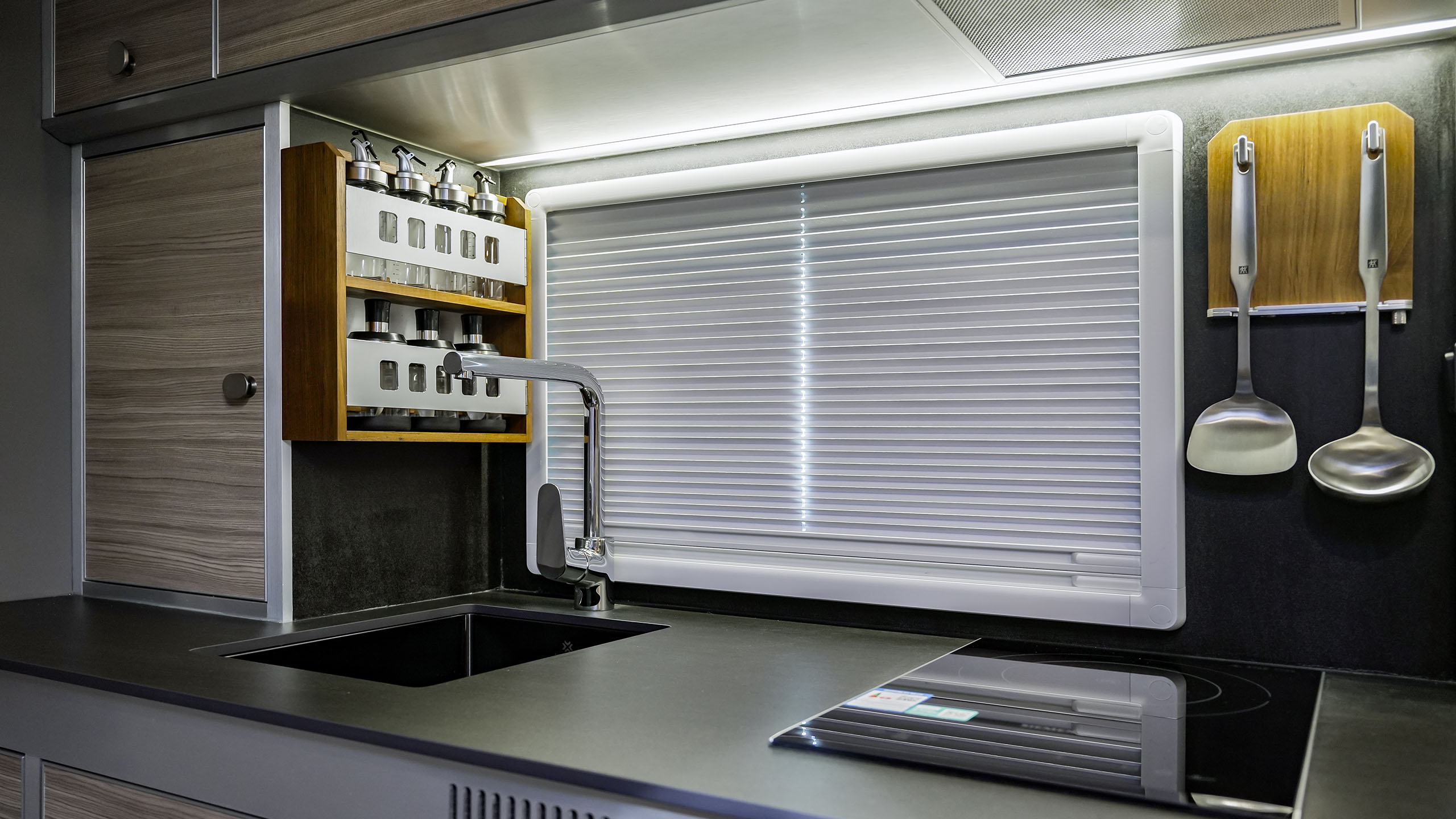 客厅的卡座沙发配上柚木升降桌,可以组合成1900x1240mm双人大床,乳胶沙发垫给你舒适睡眠。客厅顶部一张1900×1000mm的电动升降床,把主、客分区居住都安排妥当。